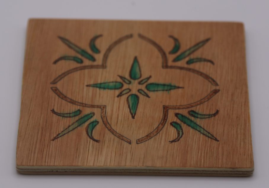 A wood coasters with a flower on it size is 100mm x 100mm