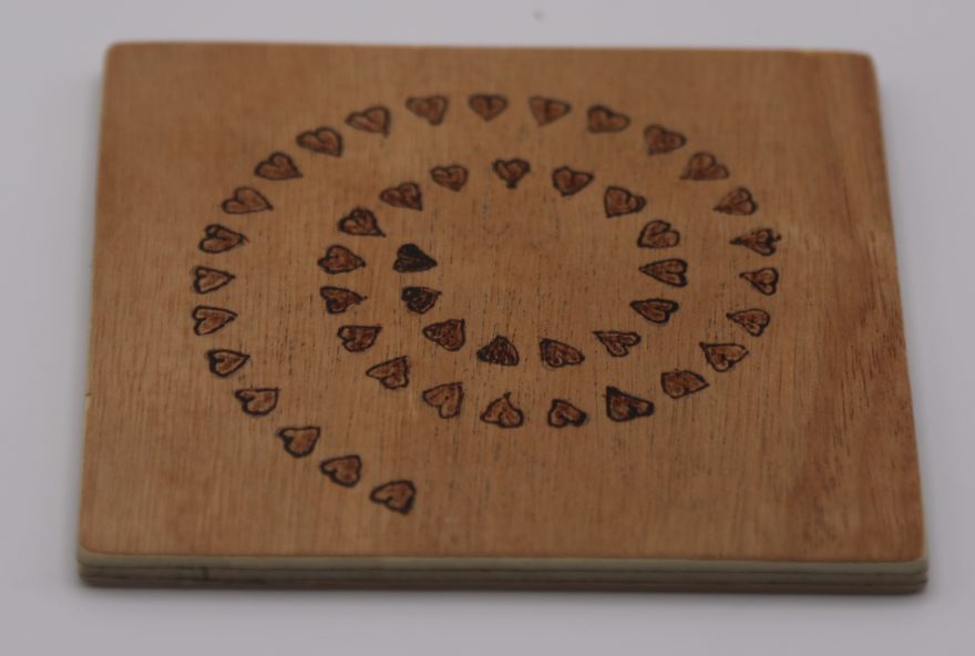 A coasters made of wood with a hart design size is 100mm x 100mm
