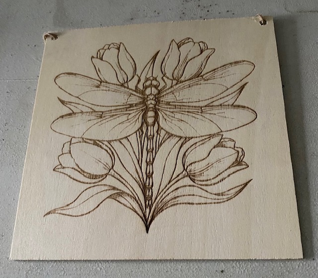 A plaque with a dragonfly on a flower the size is 150mm x 150mm