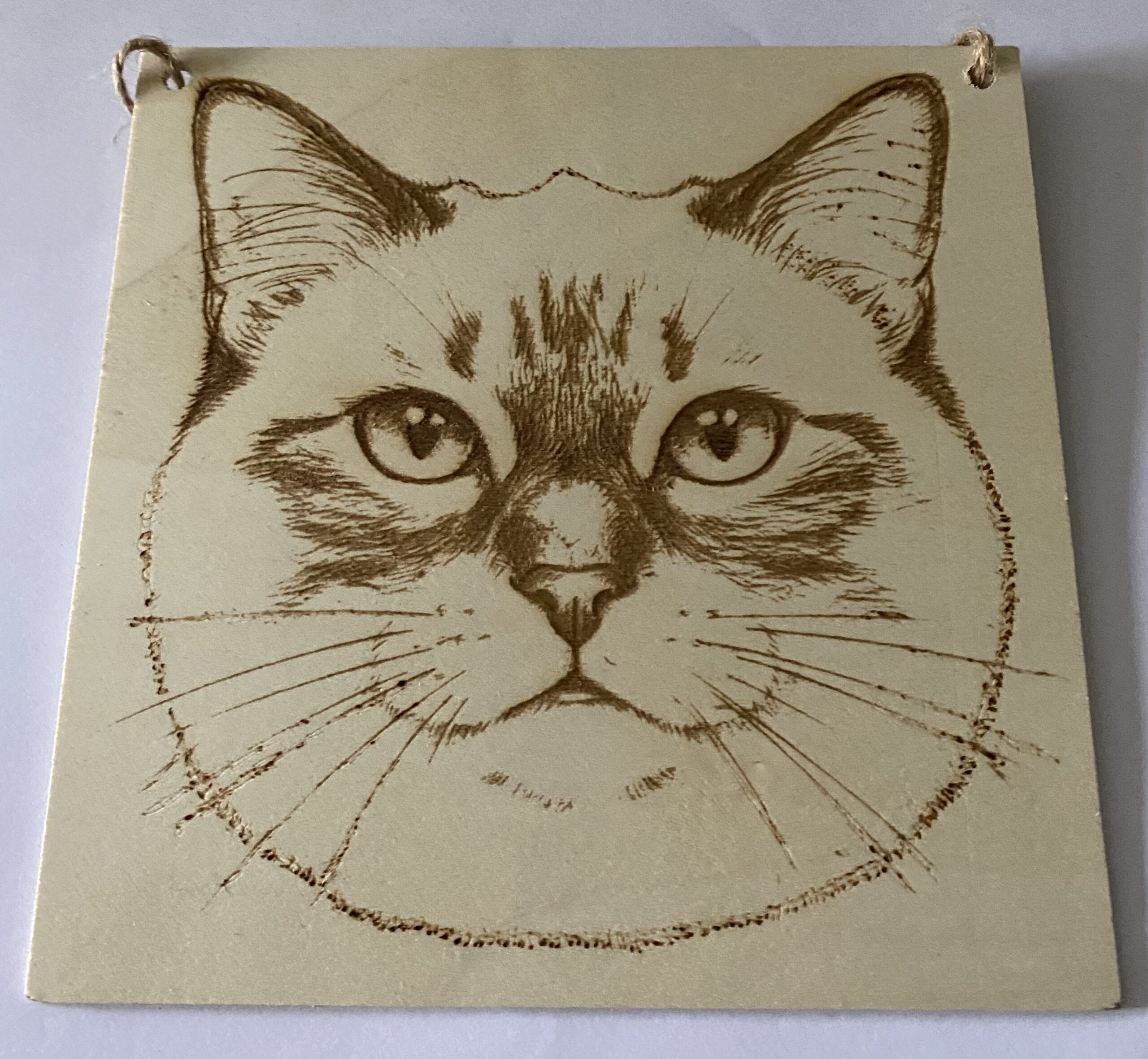 A engraved head of a cat on a wood plaque the size is 150mm x 150mm