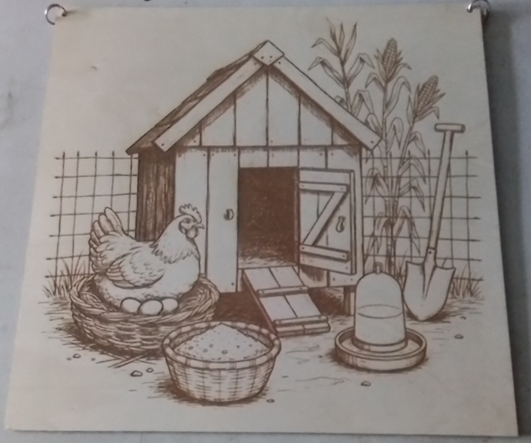 A large plaque of a chicken coupe and a chicken in a garden the size is 300mm x 300mm
