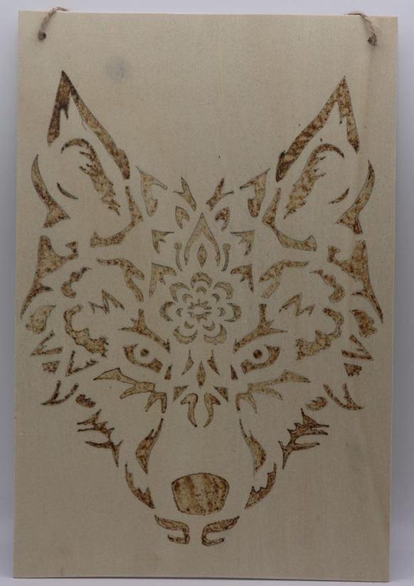 A large wood plaque of a wolfs head the size is 200mm x 300mm