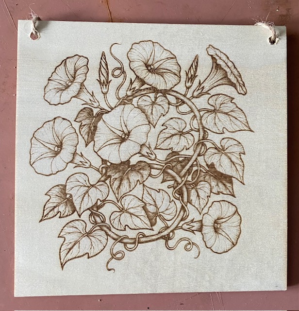 A wood plaque with a arrangement of flowers on it