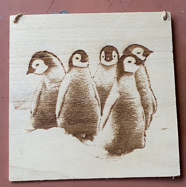 five penguin 0n a plaque