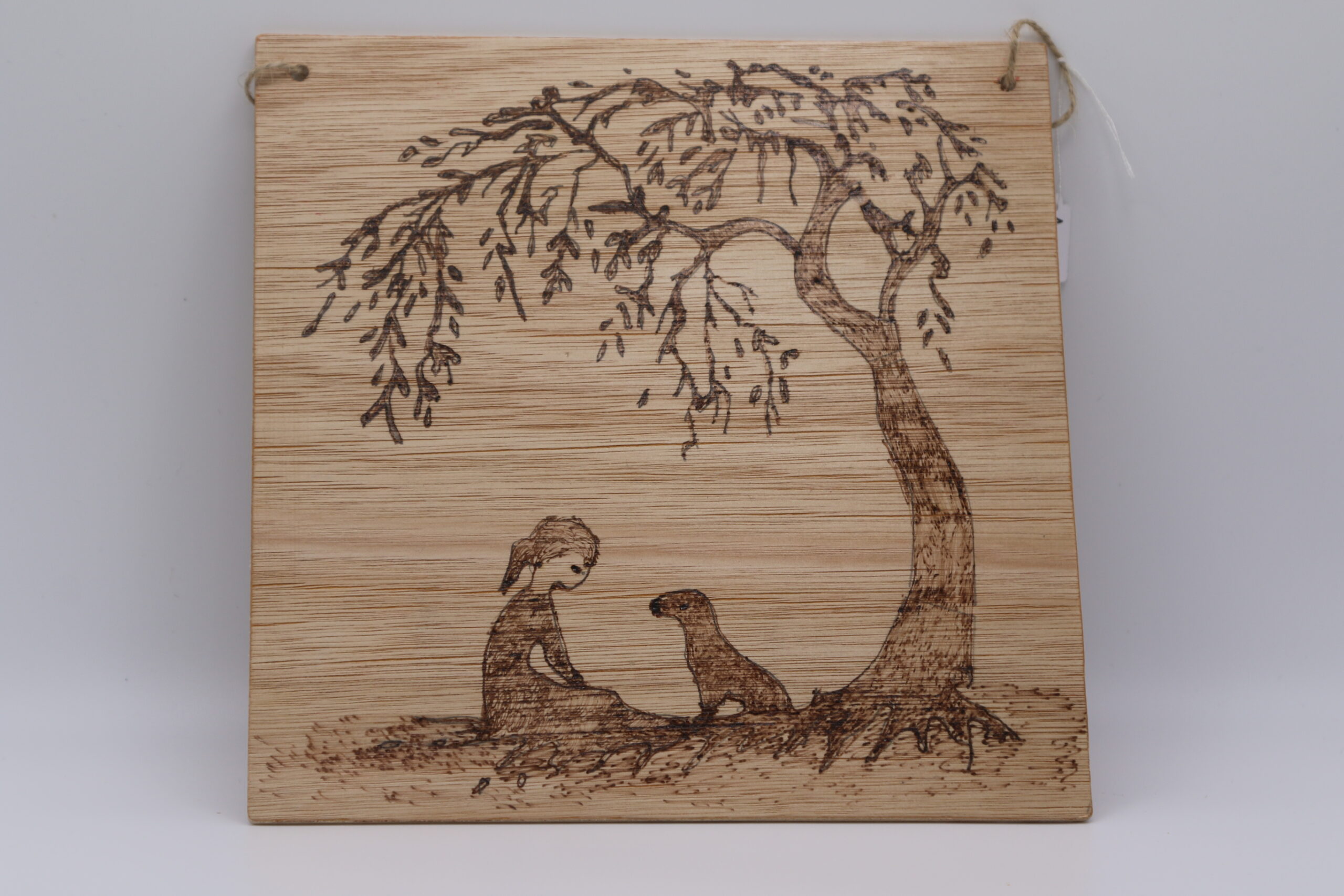 Girl under tree with dog done in pyrography