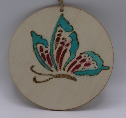 A moth design in pyrography and ink on a plaque
